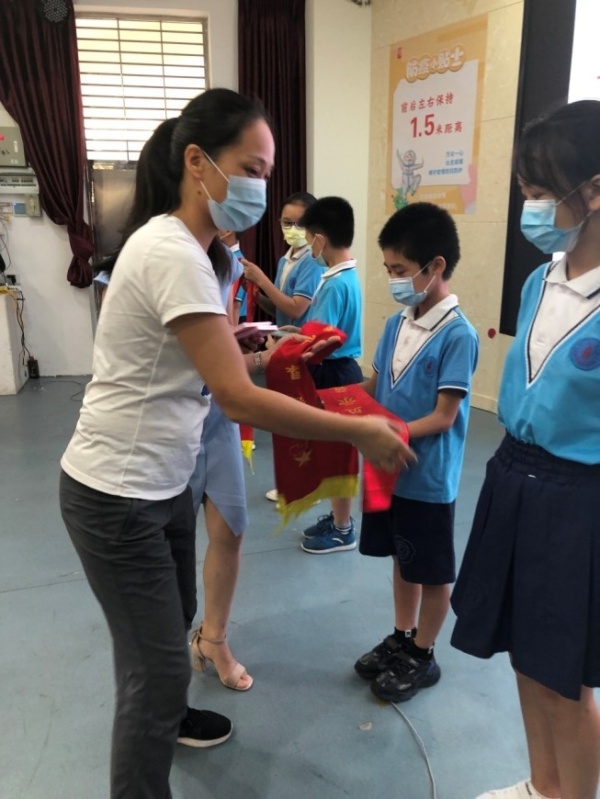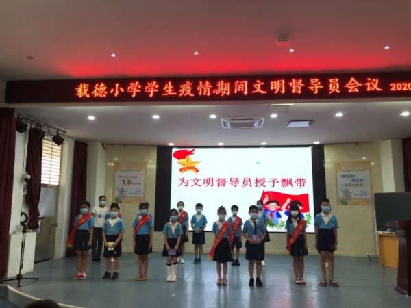 最后,各年級(jí)組長(zhǎng)為文明督導(dǎo)員們頒發(fā)記錄本和紅飄帶,文明督導(dǎo)員們拿著記錄本,將認(rèn)真記錄同學(xué)們的行為情況,披上紅飄帶,將努力承擔(dān)起創(chuàng)建文明班級(jí)、文明校園的責(zé)任。