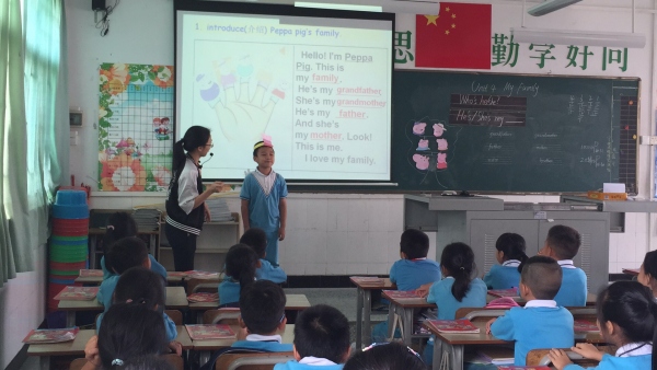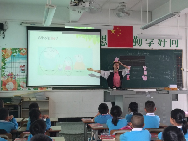 在第二節(jié)課,來自載德小學(xué)毛志敏老師展示一節(jié)三年級上冊My Family的詞匯課。毛老師本節(jié)課注重營造和諧融洽的課堂氛圍、教態(tài)自然,語調(diào)親切,并能不斷鼓勵(lì)學(xué)生,給三年級剛學(xué)英語的學(xué)生足夠勇氣去嘗試用英語來表達(dá)。毛老師通過唱歌方式調(diào)動(dòng)學(xué)生學(xué)習(xí)氛圍,設(shè)置小豬佩奇介紹家人的情景引入本課的詞匯和句型,最后通過游戲和介紹自己家人的任務(wù)來鞏固所學(xué)的目標(biāo)語言。整個(gè)教學(xué)環(huán)節(jié)環(huán)環(huán)相扣,思路清晰,課堂氣氛輕松活潑。