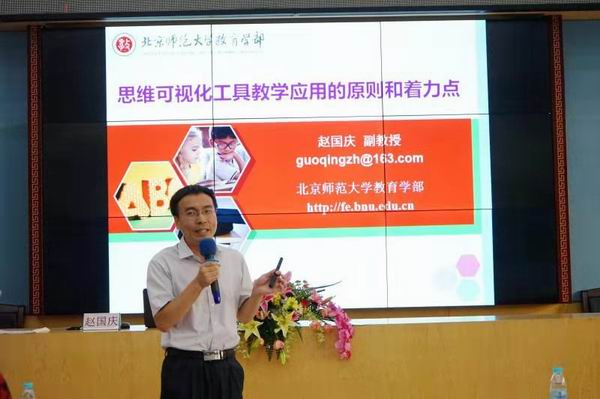 首場(chǎng)講座是北師大趙國(guó)慶副教授做了主題《思維可視化工具教學(xué)應(yīng)用的原則和著力點(diǎn)》講座。趙教授從思維可視化工具教學(xué)應(yīng)用中出現(xiàn)的典型問(wèn)題、思維可視化工具作用機(jī)理、思維可視化工具教學(xué)應(yīng)用原則以及著力點(diǎn)等方面,從理論和實(shí)踐的角度闡釋了思維可視化工具“為什么”“怎么用”存在的問(wèn)題及解決策略,令與會(huì)的不少老師大開(kāi)眼界。