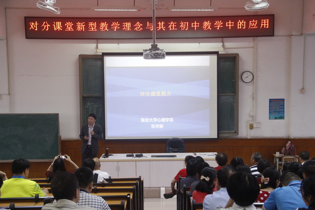 為了推進學(xué)校的品牌建設(shè)工作,實現(xiàn)我校“三導(dǎo)”課堂教學(xué)模式的升級蝶變,勒流街道新球中學(xué)擬引進“對分課堂”教學(xué)模式。10月24日,我校特意邀請了“對分課堂”教學(xué)模式的創(chuàng)始人――復(fù)旦大學(xué)社會發(fā)展與公共政策學(xué)院心理學(xué)系張學(xué)新教授,來我校為全校老師作《對分課堂新型教學(xué)理念及其在初中教學(xué)中的應(yīng)用》主題講座?;顒佑尚虑蛑袑W(xué)教研室古林海主任主持。