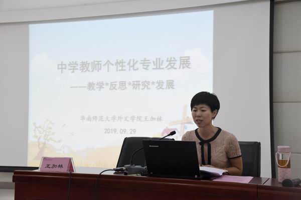 工作室的專(zhuān)業(yè)導(dǎo)師、華南師范大學(xué)外國(guó)語(yǔ)言文化學(xué)院的王加林副教授做了主題為“中學(xué)教師個(gè)性化專(zhuān)業(yè)發(fā)展――教學(xué)反思 研究 發(fā)展”的專(zhuān)題講座。王教授從2021年即將開(kāi)始的新高考展開(kāi),指出英語(yǔ)教學(xué)應(yīng)以科學(xué)、踏實(shí)的態(tài)度提高學(xué)生英語(yǔ)能力。她還用實(shí)例指導(dǎo)與會(huì)者如何選題、教研以及如何開(kāi)展行動(dòng)研究。