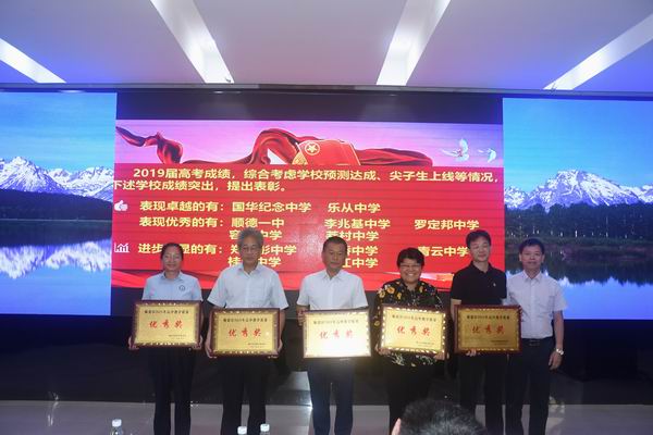 隨后,在熱烈的掌聲中,大會為2019年教學質(zhì)量突出的12所學校頒發(fā)獎牌,予以表彰。其中,榮獲卓越獎的有國華紀念中學和樂從中學;榮獲優(yōu)秀獎的有順德一中、李兆基中學、羅定邦中學、容山中學、莘村中學;榮獲進步獎的有鄭裕彤中學、華僑中學、青云中學、桂洲中學、龍江中學。