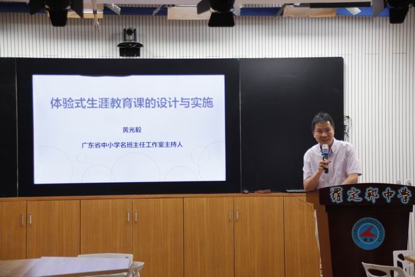 兩節(jié)研討課結(jié)束后,由廣東省第三批名班主任工作室主持人、廣東省思想政治優(yōu)質(zhì)課大賽現(xiàn)場授課特等獎獲得者黃光毅老師做課例點評以及進行《體驗式生涯課堂的構(gòu)建》專題講座。在講座過程中,黃老師從生涯公開課現(xiàn)狀掃描、生涯活動體驗的五大原則等方面對體驗式生涯規(guī)劃課堂的構(gòu)建做了深入淺出的講座。