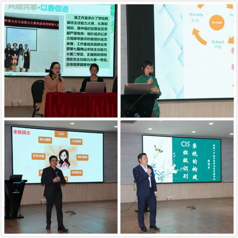 彭清老師則奉勸各位班主任“不做”全能戰(zhàn)士,根據(jù)社會(huì)互賴?yán)碚摰闹笇?dǎo),提出年級德育管理策略――團(tuán)隊(duì)互賴,多方借力。彭渭榮老師還為我們帶來《系統(tǒng)的構(gòu)建CIS班級識(shí)別》介紹,展示了CIS班級識(shí)別系統(tǒng)典型案例,引人入勝。充分體現(xiàn)了一體化德育體系構(gòu)建的獨(dú)特魅力。