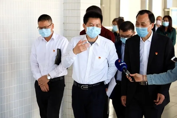 區(qū)長彭聰恩(左起三)到江義中學(xué)指導(dǎo)疫情防控工作