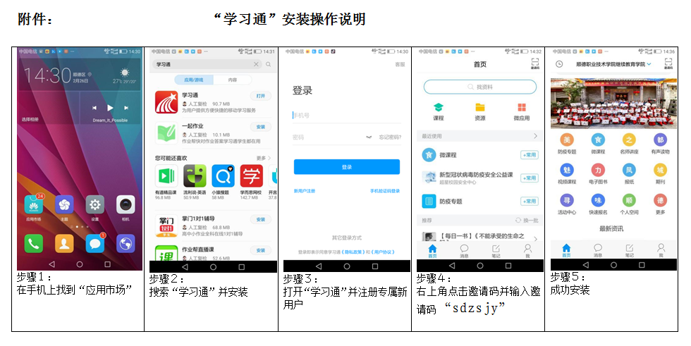 或者在手機“應用市場”搜索下載“學習通”App,進行注冊設置專屬賬號,進入App首頁點擊右上角的“掃一掃”按鈕,輸入邀請碼“sdzsjy”,即可免費學習各類教育資源(安裝圖解見附件)。