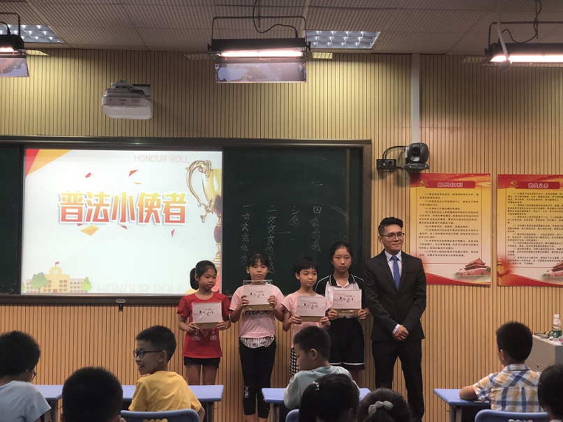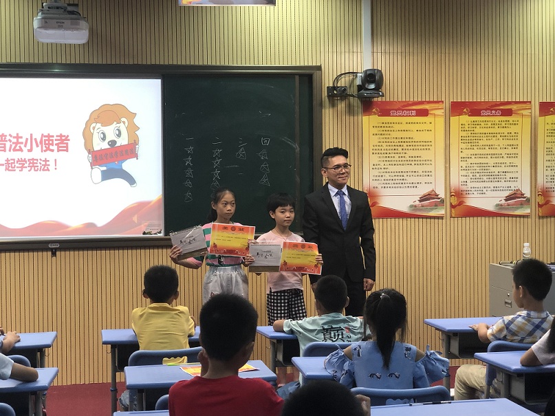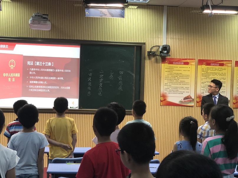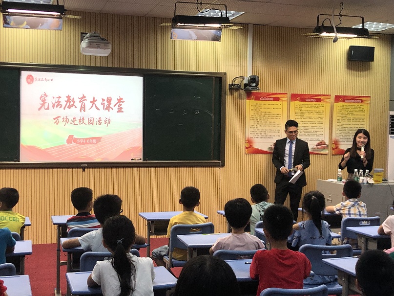 2019年7月11日下午,憲法在我心中――“憲法普法大課堂” 走進(jìn)我們學(xué)校,由廣東聚理律師事務(wù)所的何忠良律師 和吳漫律師給孩子們授課。 “憲法教育大課堂”圍繞“尊崇憲法、學(xué)習(xí)憲法、遵守憲法、維護(hù)憲法、運(yùn)用憲法”,組織開展面向孩子們的憲法學(xué)習(xí)宣傳教育活動(dòng)。