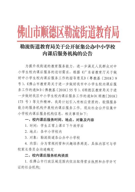 勒流街道教育局關于公開征集公辦中小學校內(nèi)課后服務機構的公告