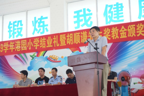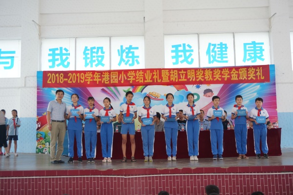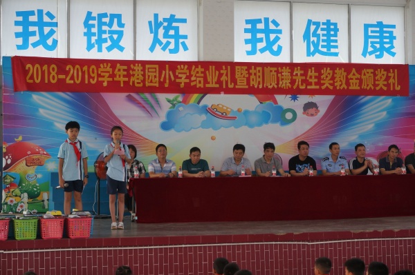 2019年7月5日的上午,港園小學(xué)全體師生歡聚學(xué)校大禮堂,共同慶祝這學(xué)期的散學(xué)禮——2018-2019學(xué)年結(jié)業(yè)禮暨胡順謙先生獎教基金頒獎會。本次頒獎會得到了港園村委的大力支持,港園村黨支部書記、村委主任胡潤安先生,港園村黨支部副書記胡家勉先生,港園村兩委委員胡卓炎先生、黃麗端女士、黃子仲先生,還有港園村熱心人士胡達(dá)川先生等出席了本次頒獎典禮。