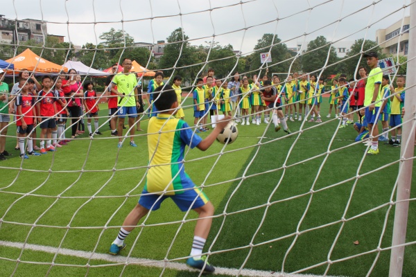 下午,就是隊員們期待已久的游園活動了。活動前期,家長義工們協(xié)助老師一共準(zhǔn)備了11個游戲,其中還有注入了很多快樂足球元素的活動,如“超級保齡球”、“射門挑戰(zhàn)”、“雙人夾球”、“瞎子踢球”等。親子義工們到達(dá)劃分好的場地,擺好道具,準(zhǔn)備好獎品,明確分工后,在學(xué)校老師一聲令下,游園活動就正式開始了。小朋友蹦蹦跳跳地跑出教室,一臉期待地擠在各個攤點看游戲規(guī)則,等待玩游戲。游戲火熱地進(jìn)行,隊員們有的在足球門前下專注地踢球;有的控著足球拍小心翼翼地繞過障礙物奔向終點;有的用力地瞄準(zhǔn)球門,用力射球;有的雙腿夾著足球,輕輕往上一挑,把足球穩(wěn)穩(wěn)地停在大車胎里……贏得游戲后,小朋友們紛紛得到各式各樣的獎品。