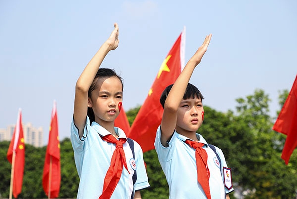 隨后,少先隊員何元斌一首蕩氣回腸的《國家》將師生們的愛國熱情推向高潮。濠涌小學的全體師生舞動紅旗,齊唱《歌唱祖國》和《我和我的祖國》。在嘹亮的歌聲中,愛心造型中央穩(wěn)穩(wěn)托起一面鮮艷的五星紅旗。全體師生共同呼號:祖國萬歲!祖國萬歲!