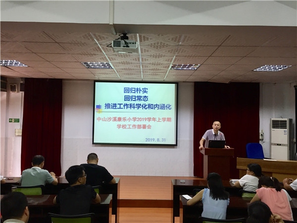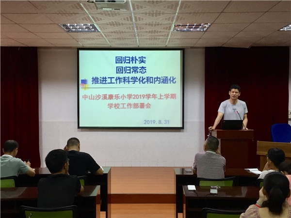 未雨綢繆布新局,謀定而動開新篇。在愉快的暑假結(jié)束之際,為確保本學(xué)期學(xué)校工作的順利進行,中山市沙溪鎮(zhèn)康樂小學(xué)于2019年8月31日召開了2019學(xué)年上學(xué)期學(xué)校全面工作部署會,全體教師參加了此次會議。本次會議由吳偉標校長主持,上午主要是校本研訓(xùn)和學(xué)校整體工作部署,下午則由學(xué)校各部門根據(jù)實際進行細節(jié)布置。