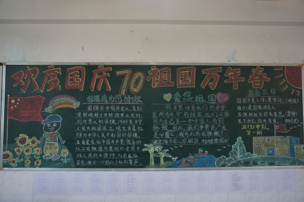 這次“喜迎中華人民共和國成立70周年黑板報”評比活動,不僅提高了各班級的班級凝聚力,同時又是一次深刻的愛國主義教育,促進了學校的文化建設。通過黑板報這塊無聲的宣傳陣地,讓虎遜每位學子都能感受到祖國70周年的喜慶,使同學們深刻地認識到現(xiàn)在的幸福生活來之不易,學會更加熱愛自己的祖國,好好學習,將來為祖國做出自己的貢獻。