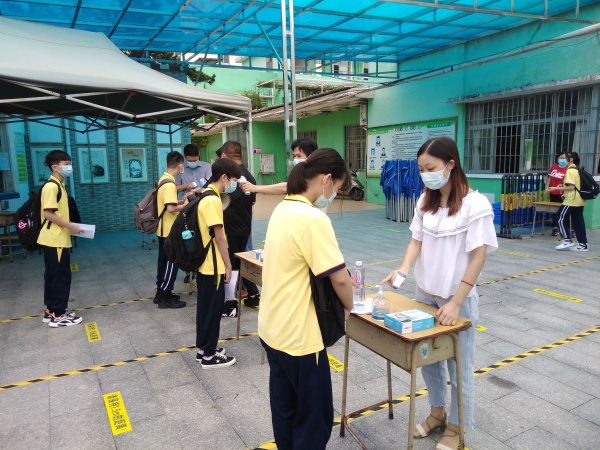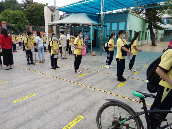 早上,學(xué)校行政和教師已經(jīng)在校門迎候返校的同學(xué)們,提前準(zhǔn)備好四個(gè)入校通道,準(zhǔn)備測溫用的額溫槍,免洗消毒液,值日教師到崗。學(xué)校行政和責(zé)任交警一起負(fù)責(zé)疏導(dǎo)校門口的交通秩序,引導(dǎo)同學(xué)們保持好間距排隊(duì),接受值日老師的測溫和掃碼,一切正常才能順利進(jìn)校。