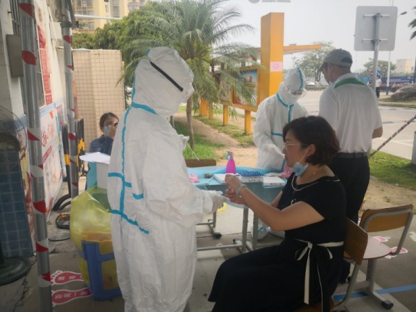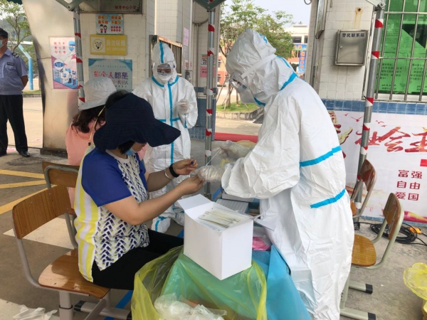 上午8時,神灣中心小學(xué)在學(xué)校東門增設(shè)核酸采樣點和被檢測人員登記點。為了給學(xué)校教職工提供更安全、規(guī)范的采樣環(huán)境,華銀公司專門組織了一支核酸檢測隊伍,他們事先根據(jù)學(xué)校提供的受檢教職工信息,提前準(zhǔn)備好受檢人條碼和登記冊。采樣現(xiàn)場,所有受檢教職員工按要求佩戴口罩,互相間隔一米,按照從低到高的級組順序排隊受檢。首先在受檢人員登記處核對姓名、登記、領(lǐng)取細胞保存液。然后有序去檢測點配合醫(yī)護人員接受采樣。整個過程井然有序,歷時一個多小時,在炎炎夏日的炙烤下,醫(yī)護人員依舊有耐心地指導(dǎo)受檢人員接受采樣。