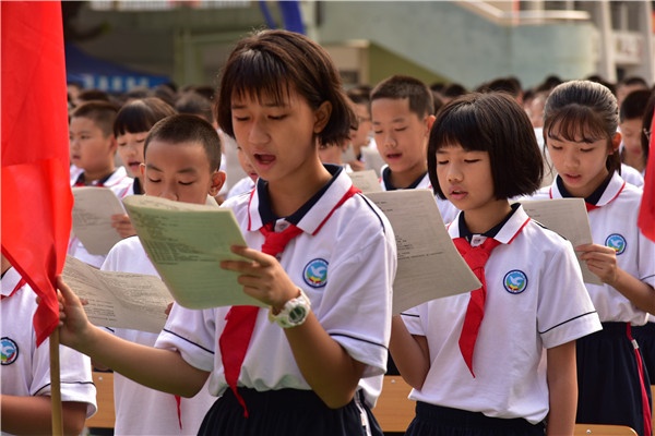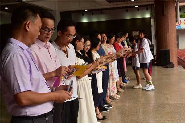 隨后,全校學(xué)生為老師們誦讀朗誦詞。依次是初三級(jí)詩朗誦《致我們敬愛的老師》,初二級(jí)《奉獻(xiàn),是你的名字》,初一級(jí)《九月,屬于老師》,最后全體學(xué)生合誦感念師恩誦詞。整齊而響亮的朗誦聲響徹校園,久久回蕩。