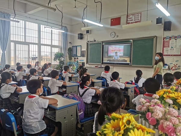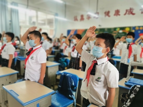 惠風(fēng)和暢,鳥(niǎo)語(yǔ)花香,鳳凰花開(kāi),少年歸來(lái)。在經(jīng)歷了一個(gè)漫長(zhǎng)而又難忘的寒假,終于迎來(lái)了四、五、六年級(jí)學(xué)生復(fù)學(xué)返校。5月18日,開(kāi)發(fā)區(qū)中心小學(xué)舉行了復(fù)學(xué)返校的第一次升旗儀式,伴隨著莊嚴(yán)的國(guó)歌,五星紅旗冉冉升起,全體學(xué)生在教室里面向國(guó)旗行少先隊(duì)禮,全體老師行注目禮。
