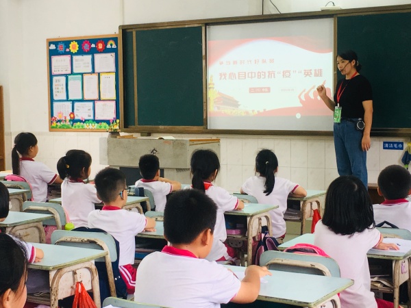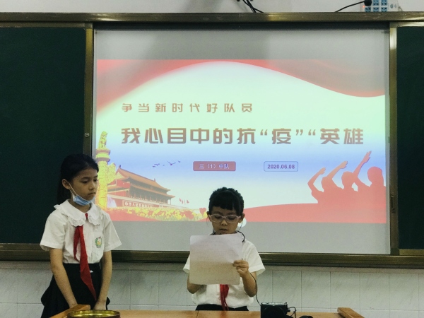 此次主題班會活動在各班老師的有序組織下進行。教室里,孩子們身著禮服,佩戴鮮艷紅領巾,坐姿端正,認真聆聽臺上同學分享他們心中的抗“疫”英雄故事?!拔乙恢痹趯ふ乙粋€英雄的榜樣……” “當疫情暴發(fā)時,他又義無反顧地去了武漢……”聽到一個個感人的故事,教室里一次次響起了熱烈的掌聲!英雄們的故事,將像春天的種子,在每個同學的心里都種下了一顆英雄夢,而這些掌聲,代表了孩子們對英雄們崇高的敬仰與欽佩!能在疫情面前挺身而出的人,有科學家、有醫(yī)生、有快遞員、有保安等各行各業(yè)的人,他們是身邊人,他們是普通人,而他們就是英雄,他們就是我們學習的榜樣!