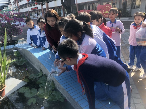 活動伊始,由少先隊(duì)輔導(dǎo)員阮結(jié)連老師向參加活動的師生代表講解了“班魚”入池活動的意義,并以現(xiàn)場提問互動的方式與學(xué)生交流。各班級學(xué)生向大家介紹了本班“班魚”的名字和品種。隨后,德育處阮雪屏主任宣布“班魚”入池儀式正式開始,各班級有序地向校園主體景觀“海闊憑魚躍”放入“班魚”。“樂樂”、“學(xué)學(xué)”、“四喜”等25條“班魚”正式成為五小的一份子,穿梭在清澈的池水里,一會休憩,一會玩耍,構(gòu)成了一幅生機(jī)勃勃的畫面。最后,五小德育處阮雪屏主任結(jié)合學(xué)校新建成的主題景觀對學(xué)生進(jìn)行“愛校愛班愛生”教育,并建議各班級成立“班魚”守護(hù)小組,把學(xué)生高度關(guān)注的素材作為德育的契機(jī)。