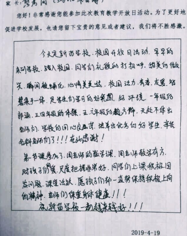 活動結(jié)束后,家長們將學(xué)校印發(fā)的一張張調(diào)查問卷交到老師們的手中,家長們在充分認可學(xué)校教學(xué)宗旨與教學(xué)成果的同時,也從學(xué)校管理、教師配備、教師素質(zhì)、教學(xué)管理和安全衛(wèi)生等方面提出了中懇的建議。