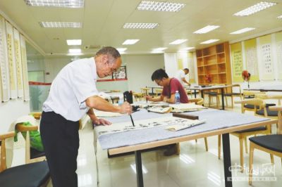 市民在東鳳鎮(zhèn)黨群服務(wù)中心新時代文明實踐站的書法課堂上練習(xí)書法。