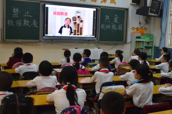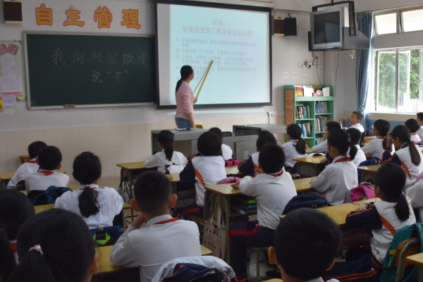 當(dāng)天早上,學(xué)校通過(guò)國(guó)旗下講話、校園廣播等形式,引導(dǎo)學(xué)生了解校園欺凌事件的預(yù)防知識(shí)和處理方式。上午第一節(jié),各班在教室里開(kāi)展了形式多樣的班會(huì)活動(dòng)。各班在班主任的精心組織下,有的觀看了《預(yù)防校園暴力,共建和諧校園》專(zhuān)題教育片。同學(xué)們?cè)谟^看了校園欺凌的案例后展開(kāi)了激烈的討論,主要討論了校園暴力及其危害、如何預(yù)防和應(yīng)對(duì)校園暴力、實(shí)施校園暴力,是否需要承擔(dān)法律責(zé)任等相關(guān)內(nèi)容。有的老師則以發(fā)生在校園內(nèi)的中小學(xué)生欺凌和暴力現(xiàn)象為切入點(diǎn),以案釋法,通過(guò)視頻播放、法律講解等形式與學(xué)生進(jìn)行交流和互動(dòng),引導(dǎo)學(xué)生共同了解校園欺凌的含義,發(fā)生的原因及其危害性,增強(qiáng)了學(xué)生的反欺凌意識(shí),切實(shí)提高了學(xué)生明辨是非和自我保護(hù)能力。通過(guò)主題鮮明,形式多樣班會(huì)課,學(xué)生對(duì)“校園欺凌”有了進(jìn)一步的認(rèn)識(shí),掌握了預(yù)防校園欺凌的應(yīng)對(duì)辦法。最后,各班班主任還進(jìn)行了相關(guān)總結(jié),并提醒學(xué)生如果遇到了校園欺凌時(shí),不要藏在心里,要第一時(shí)間告訴老師或家長(zhǎng),尋找共同解決的辦法。