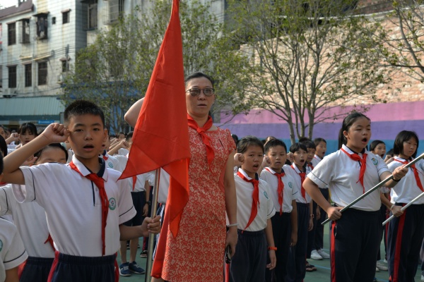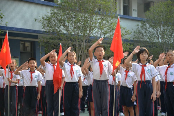 早晨8點,石岐張溪鄭二小學(xué)全體師生在激昂的運動員進行曲下整齊有序地來到操場。全校教師佩戴著鮮艷的紅領(lǐng)巾在升旗臺前面排成整齊的隊伍。一切準(zhǔn)備就緒,升旗手們邁著莊嚴(yán)而整齊的步伐走到旗臺下?!吧龂?,奏唱國歌,敬禮!”全體師生莊重地注視著冉冉升起的國旗,表達著對國旗的無限敬意。隨著雄壯高昂的旋律響起,隊員們高唱隊歌,用嘹亮的歌聲表達著對紅領(lǐng)巾的熱愛,隊員們激情昂揚,朝氣蓬勃。隊旗高高飄揚,星星火炬閃耀著金光,隊鼓鏗鏘而嘹亮,召喚著伙伴響徹四方。隨后,五(2)中隊同學(xué)帶來國旗下講話《中國的生日》,稚嫩的聲音承載著深情的祝福。接著,大隊輔導(dǎo)員周銳鵬老師帶領(lǐng)大家重溫入隊誓詞,在隊旗下莊嚴(yán)宣誓。六(2)中隊同學(xué)帶來詩歌朗誦《我是光榮的少先隊員》,“隊旗飄飄,歌聲嘹亮,我們的心在激蕩,我們的情在流淌,每一塊紅領(lǐng)巾都是用鮮血染成,每一位少先隊員都能沐浴到黨的陽光”,讓同學(xué)們感受到作為少先隊員的光榮和自豪?;顒幼詈?,大隊輔導(dǎo)員周老師帶領(lǐng)隊員呼號:“準(zhǔn)備著,為共產(chǎn)主義事業(yè)而奮斗!”全體隊員高聲回應(yīng)著:“時刻準(zhǔn)備著!”映襯著紅領(lǐng)巾的光輝,每個孩子都精神抖擻,洋溢著自豪的笑容。