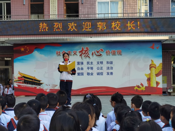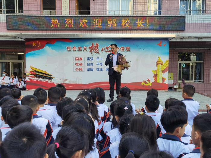 隨后,郭校長進行國旗下講話。他說帶來一份禮物送給全校師生,是三顆“真、善、美”的種子。郭校長在講話中引用大教育家陶行知的話“千教萬教,教人求真,千學萬學,學做真人”,并結(jié)合身邊的故事生動形象的表達了自己對全校師生的要求和期盼。