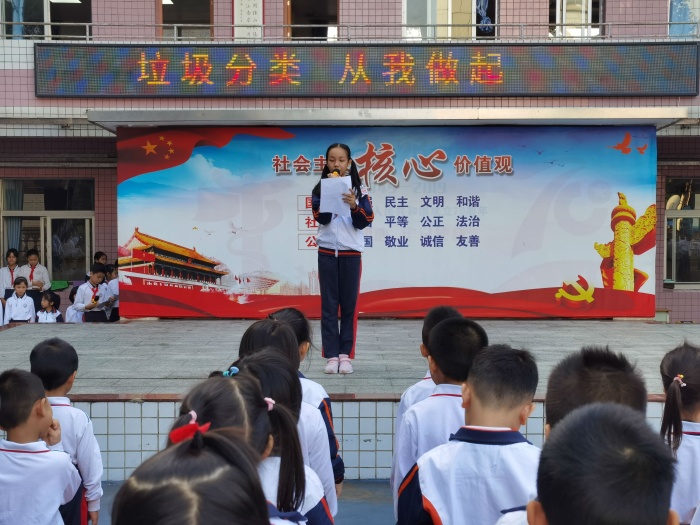 首先由六(5)班韋欣言同學(xué)進(jìn)行國旗下講話,向全體同學(xué)宣讀垃圾分類倡議書,倡議全體學(xué)生樹立垃圾分類意識,爭當(dāng)引領(lǐng)者;執(zhí)行垃圾分類標(biāo)準(zhǔn),爭當(dāng)執(zhí)行者;普及垃圾分類知識,爭當(dāng)宣傳者;維護(hù)垃圾分類成果,爭當(dāng)督導(dǎo)者。