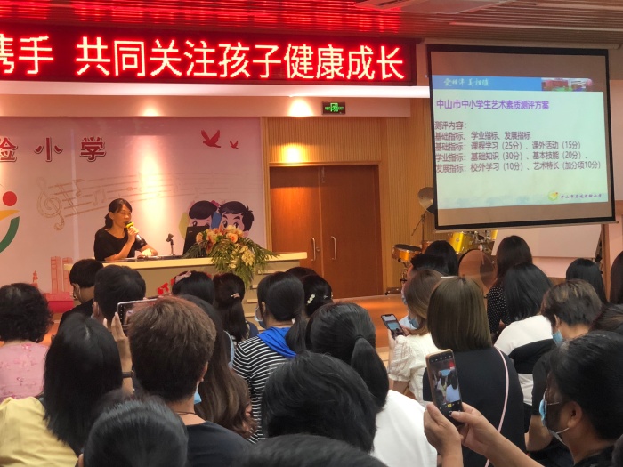 接著,盧主任為全校家長解讀了《中山市中小學(xué)藝術(shù)素質(zhì)測評實施方案》。藝術(shù)測評重點關(guān)注學(xué)生藝術(shù)課程課堂學(xué)習和學(xué)生參與藝術(shù)實踐的經(jīng)歷。涵蓋基礎(chǔ)指標、學(xué)業(yè)指標、發(fā)展指標三大板塊,包括課程學(xué)習、課外活動、基礎(chǔ)知識、基本技能、校外學(xué)習、藝術(shù)特長等六個方面的內(nèi)容。希望家長們予以重視。