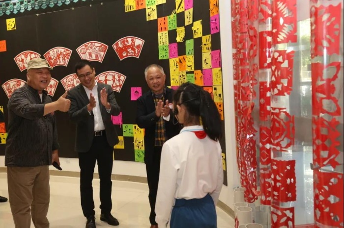 由于大信學(xué)校美術(shù)特色教育工作才開(kāi)展得有聲有色,2021年學(xué)校被評(píng)為了“廣東省民間工藝美術(shù)特色學(xué)校實(shí)驗(yàn)基地”,由楊福軍老師擔(dān)任主持人。隨著“1——2——3”的口令,周鳳甫老師、鄭舒文老師、沈文老師、周文麗老師、馮冠祥校長(zhǎng)和楊福軍老師共同揭開(kāi)了這塊沉甸甸的牌匾,這同時(shí)也是學(xué)校美術(shù)工作的一個(gè)新的起點(diǎn)開(kāi)始。揭牌儀式完成,隨即就是“百變剪紙”的開(kāi)幕剪彩。新穎的剪彩形式,讓傳統(tǒng)和現(xiàn)代對(duì)接、讓激情和努力互溶,讓大信學(xué)校剪紙?zhí)厣虒W(xué)堅(jiān)實(shí)的邁出了第一步。