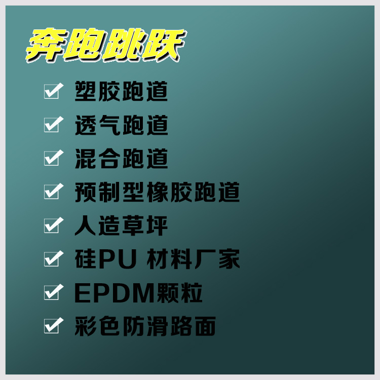 PU顆粒、顏料、助劑、填料組成。塑膠跑道具有平整度好、抗壓強度高、硬度彈性適當、物理性