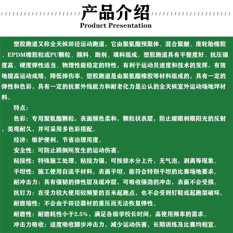 塑膠跑道又稱全天候田徑運動跑道,它由聚氨酯預(yù)聚體、混合聚醚、廢輪胎橡膠、EPDM橡膠?;騊U顆粒、顏料、助劑、填料組成。塑膠跑道具有平整度好、抗壓強度高、硬度彈性適當(dāng)、物理性能的特性,有利于運動員速度和技術(shù)的發(fā)揮,有效地運動成績,摔傷率。塑膠跑道是由聚氨酯橡膠等材料組成的,具有一定的彈性和色彩,具有一定的抗紫外線能力和耐老化力是公認(rèn)的全天候室外運動場地坪材料。