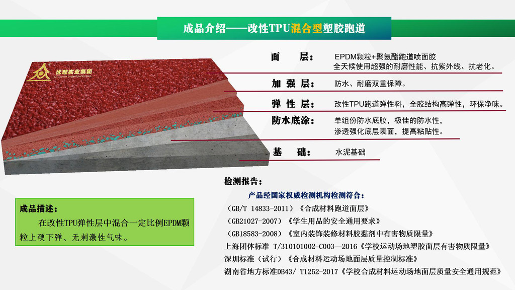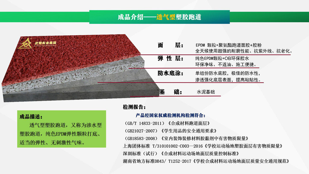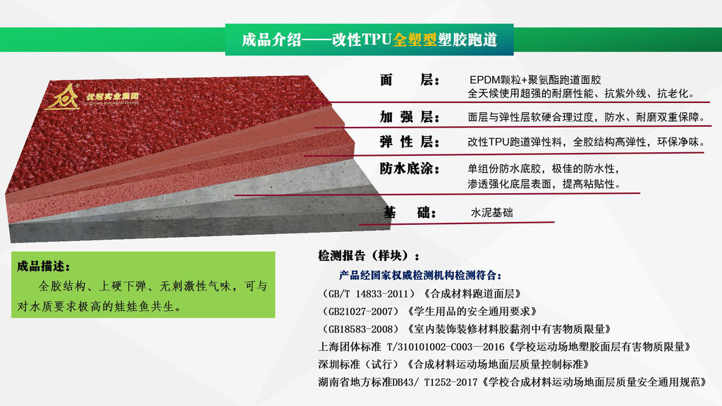 優(yōu)冠實(shí)業(yè)集團(tuán)有限公司(以下簡(jiǎn)稱集團(tuán))是一家專業(yè)從事運(yùn)動(dòng)場(chǎng)地材料,人造草坪研發(fā)、生產(chǎn)、銷售、鋪裝的科技創(chuàng)新型企業(yè),是湖南省地方標(biāo)準(zhǔn)DB43/ T1252-2017《學(xué)校合成材料運(yùn)動(dòng)場(chǎng)地面層質(zhì)量安全通用規(guī)范》主要起草單位之一。公司具備國(guó)際田聯(lián)(IAAF)認(rèn)證、國(guó)際網(wǎng)聯(lián)(ITF)認(rèn)證、中國(guó)環(huán)境標(biāo)志產(chǎn)品認(rèn)證、中國(guó)綠色材料標(biāo)志授權(quán)使用證書、企業(yè)生產(chǎn)環(huán)評(píng)批復(fù)報(bào)告、安全生產(chǎn)標(biāo)準(zhǔn)化三級(jí)企業(yè)證書、對(duì)外貿(mào)易經(jīng)營(yíng)者備案登記表等,并成為湖南省政府采購(gòu)協(xié)會(huì)會(huì)員。集團(tuán)下轄湖南優(yōu)冠體育材料有限公司、五舟體育設(shè)備制造有限公司、湖南康普斯人造草坪有限公司、湖南科迪環(huán)保科技有限公司、湖南優(yōu)冠運(yùn)動(dòng)場(chǎng)鋪裝技術(shù)服務(wù)有限公司、湖南優(yōu)冠塑膠體育工程有限公司。