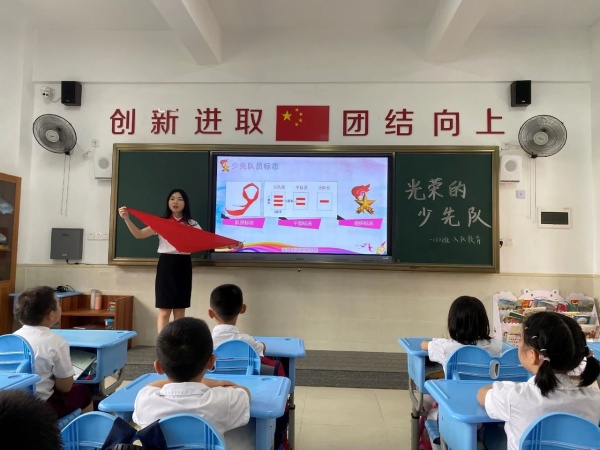 在課堂上,同學們認真地聆聽老師的講解,通過學習少先隊的歷史,激勵同學們從小就要養(yǎng)成良好的行為習慣,一起努力爭做合格的共產主義接班人。接著,學習自己佩戴紅領巾、正確佩戴好隊徽,嘹亮的中國少年先鋒隊隊歌在校園里回蕩。