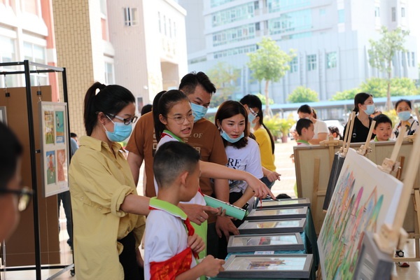 與此同時,該校校慶主題書畫作品在大堂同步展出。據(jù)悉,本次書畫展早在上學(xué)期就已開始策劃、籌備,從學(xué)校的特色教育出發(fā),美術(shù)科組的老師們帶領(lǐng)社團(tuán)的孩子們精心準(zhǔn)備,展出了版畫、水彩畫、書法、雕刻等形式各樣的作品,現(xiàn)場“圈粉”無數(shù),有的駐足在學(xué)生的書法作品前,嘖嘖稱奇;有的流連于版畫作品中,細(xì)細(xì)品味;有的拿起了手機(jī),留下一份份精彩的記憶。