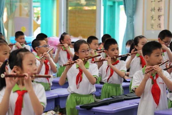 清晨的校園里隨處可見忙碌的身影,竹笛社團(tuán)的孩子們在學(xué)校西門吹奏《青花瓷》《我愛你中國》《童年》等曲目,用優(yōu)美旋律迎接各方來賓;南門名人園里,在鐘遠(yuǎn)良老師的電子琴伴奏下,六2班袁鴻林、六5班劉馨瑜等幾位優(yōu)秀竹笛學(xué)生代表輪番演奏《牧民新歌》《姑蘇行》等經(jīng)典曲目;東門童趣園里,六6班全體學(xué)生吹響《每當(dāng)我走過老師窗前》《紅星歌》等耳熟能詳?shù)母枨?/p>