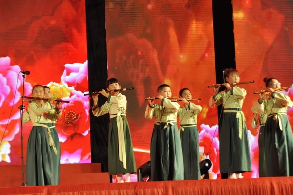 晚上7點30分,學(xué)校運(yùn)動場燈光流轉(zhuǎn), “綻放”十周年校慶文藝晚會準(zhǔn)時開幕。開發(fā)區(qū)文體教育局局長趙云清、中山市教育招生考試中心副主任周勇、開發(fā)區(qū)教育事務(wù)指導(dǎo)中心主任鐘海清、副主任關(guān)影紅及區(qū)內(nèi)各學(xué)校領(lǐng)導(dǎo)出席。本次晚會分為蓄力飛翔、感動十載、筑夢未來三個篇章,共13個節(jié)目。首先,在呂曉寧老師的指揮下,全體學(xué)生整齊起立,二至六年級共1800多名學(xué)生用手中的竹笛奏響《歡迎曲》,一年級的學(xué)生則用雙手打起節(jié)奏,現(xiàn)場千人合奏場面震撼,彰顯香暉園小學(xué)全面普及竹笛教育的成果。本場晚會,葉建林老師的竹笛獨奏《春到湘江》、呂曉寧老師指導(dǎo)的民樂合奏《金蛇狂舞》、竹笛合奏《揚(yáng)鞭催馬運(yùn)糧忙》以及余夢園老師指導(dǎo)的竹笛二重奏《跑旱船》等精彩的竹笛節(jié)目更是將小小竹笛的魅力呈現(xiàn)得淋漓盡致。此外,故事講演、情景劇、合唱、創(chuàng)意服裝秀等豐富多樣的節(jié)目更是精彩紛呈,現(xiàn)場氣氛熱烈。