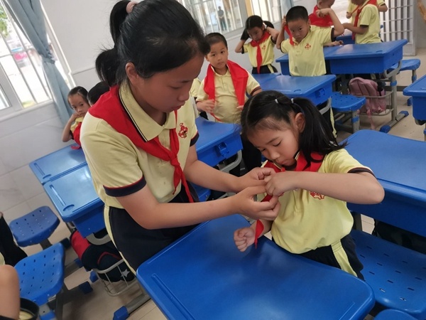 大隊(duì)委員們耐心地講解了中國少先隊(duì)組織機(jī)構(gòu)、發(fā)展過程和歷史貢獻(xiàn)。詳細(xì)講解了“六知六會一做”的知識,并且手把手的一年級的弟弟妹妹們敬隊(duì)禮,佩戴紅領(lǐng)巾,學(xué)唱少年先鋒隊(duì)隊(duì)歌,如何宣誓和呼號等,一年級的小同學(xué)們聽的很認(rèn)真,每一雙小眼睛都散發(fā)出渴望成為一名少先隊(duì)員的光芒。
