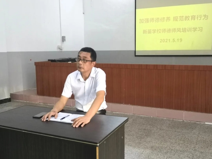 為進(jìn)一步提高教師的業(yè)務(wù)水平,樹(shù)立良好的教師形象,打造一支師德高尚、教風(fēng)優(yōu)良的優(yōu)秀團(tuán)隊(duì),5月19 日晚,新苗學(xué)校組織全體教師在修身學(xué)堂開(kāi)展了以“加強(qiáng)師德修養(yǎng) 規(guī)范教育行為”為主題的師德師風(fēng)培訓(xùn),此次培訓(xùn)由段岳華副校長(zhǎng)主持。
