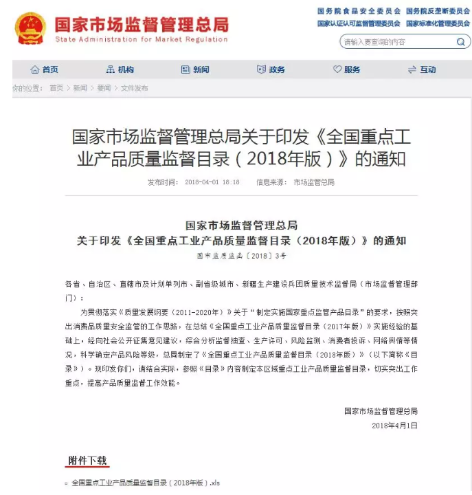 4月1日,國家市場監(jiān)督管理總局印發(fā)了關(guān)于《全國重點(diǎn)工業(yè)產(chǎn)品質(zhì)量監(jiān)督目錄(2018年版)》的通知: