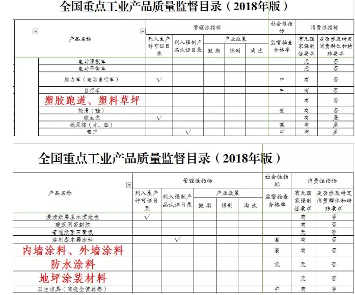 其中,塑膠跑道、人造草坪、內(nèi)墻涂料、外墻涂料、防水涂料、地坪涂裝材料等被列入《監(jiān)督目錄》,有國家強(qiáng)制性要求(消費(fèi)性指標(biāo))。