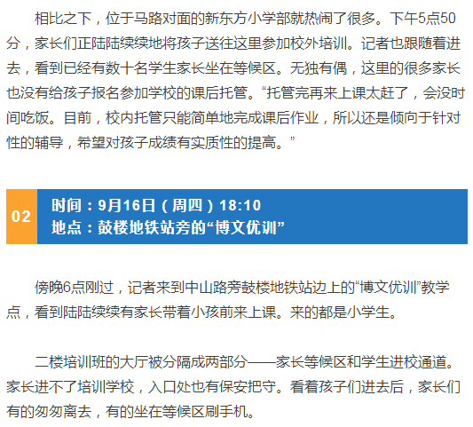 一位爸爸告訴記者,孩子上三年級了,“上的應(yīng)該是數(shù)學(xué)培訓(xùn)班吧”,他有點不太確定,說是孩子媽媽報的,“我只負(fù)責(zé)接送。17:30把孩子從學(xué)校接出來,18:30之前趕到這里培訓(xùn),晚飯吃得非常匆忙。接下來,要看看是否會適應(yīng)。”他說上學(xué)期孩子也在這里上培訓(xùn)班,報了兩門學(xué)科,是周六上午,學(xué)4個小時,“我把孩子送進(jìn)后,4個小時里還能干些自己的事”,如今“雙減”后,學(xué)科培訓(xùn)只能在周中的晚上,大約20:00下課,因為政策規(guī)定線下培訓(xùn)結(jié)束時間不晚于20:30,“從18:30到20:00,只有一個半小時,我也干不了什么,索性就在這里等,看看書?!?/p>