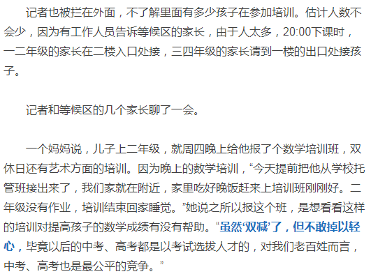 “TA的同學(xué)都在培訓(xùn),我們?nèi)绻蝗ヅ嘤?xùn),怕落后啊”“之前一直在培訓(xùn),一下子不參加培養(yǎng),不習(xí)慣”“我們家長教不了,而且教他他也不聽,只好送培訓(xùn)班,也許老師說了他會聽”“’雙減’了,孩子們是無憂無慮了,但我們家長們還是焦慮,畢竟以后的中考、高考還是要考試的呀”……這是記者聽到家長們說得最多的幾個“典型性”理由。