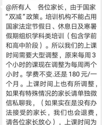 仔細解讀政策后發(fā)現(xiàn),教育部嚴查周末開課,而周中補課不在監(jiān)管范圍內,于是各個補習機構開始發(fā)布調課通知,將周末課程安排在周中。