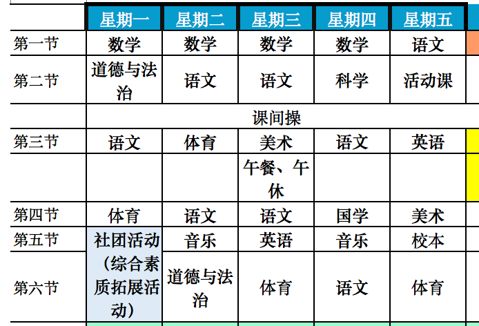 數(shù)一數(shù)就會發(fā)現(xiàn):每周6節(jié)語文課,5節(jié)數(shù)學(xué)課,4節(jié)體育課,3節(jié)英語課(上學(xué)期4節(jié))......