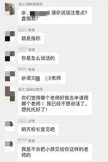 看著群聊截圖,實在難以想象這是一位班主任在和家長進行“親切交流”,群里面的家長也紛紛憤怒了,表示明天我們校長辦公室見。