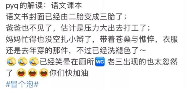 從網(wǎng)友們對(duì)小學(xué)語文教材封面的聯(lián)想,也能感受到對(duì)三胎問題的生育焦慮和教育焦慮。不過這一系列問題都在進(jìn)一步解決中,在觀望三胎政策的家庭也可以繼續(xù)等待政策的改善。