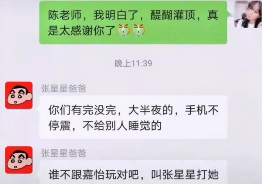 有了家長群,學(xué)生出現(xiàn)問題的時候,家長和老師經(jīng)常在群里討論。不過這天已經(jīng)接近半夜12點了,老師和一位家長還在談?wù)搶W(xué)生的表現(xiàn)。結(jié)果氣的張星星爸爸在群里回懟別人毫不留情,還直言叫張星星打架,真是沒誰了。