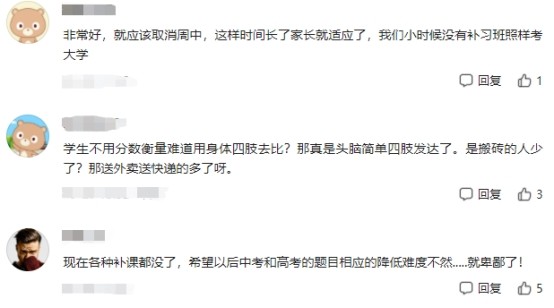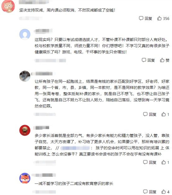 對(duì)于“雞娃”家長來說,學(xué)科性培訓(xùn)機(jī)構(gòu)被取締,意味著關(guān)上了校外學(xué)科性培訓(xùn)的“大門”,一些資質(zhì)平庸的孩子將沒有“開小灶”的機(jī)會(huì),他們想要趕超成績優(yōu)異的孩子將難上加難。“沒了校外培訓(xùn)機(jī)構(gòu),會(huì)有不少孩子考不上中學(xué)和高中,這些人將被安排到職校學(xué)習(xí),成為“藍(lán)領(lǐng)”,這些人可怎么辦呢?”有家長表示。